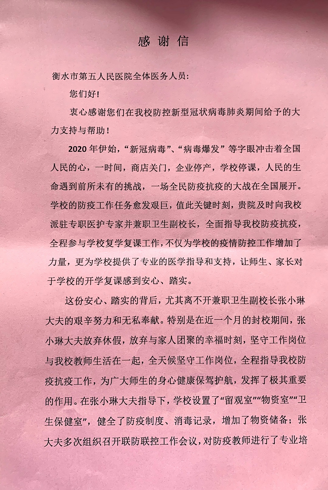 6月16日,我院收到市职教中心送来的一封感谢信。信中诚挚感谢我院王玉新院长疫情期间为学校派驻专职医师,全面参与指导学校防疫抗疫及复学复课工作,并聘请我院张小琳同志兼职衡水职教中心卫生副校长。