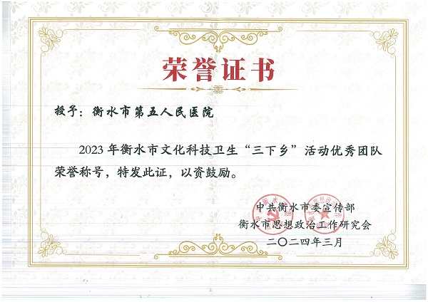 近日,我院被中共衡水市委宣传部、衡水市思想政治工作研究会授予“2023年度衡水市文化科技卫生‘三下乡’活动优秀团队荣誉称号。