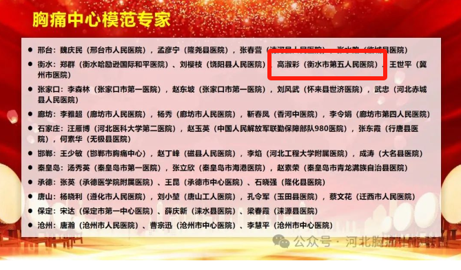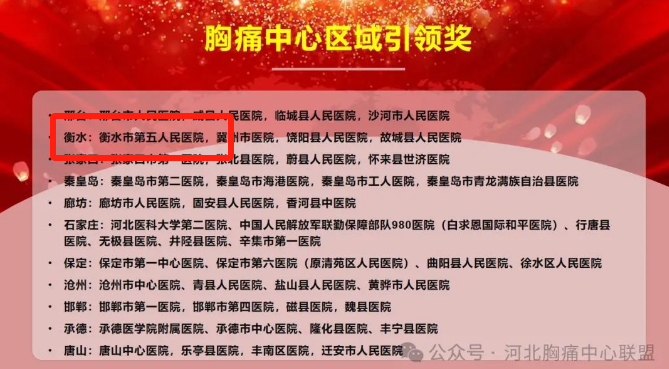12月26日,在河北省胸痛中心联盟公布的2024年表彰名单中,衡水市第五人民医院荣获“胸痛中心区域引领奖”。同时,内三科高淑彩主任荣获“胸痛中心模范专家”称号