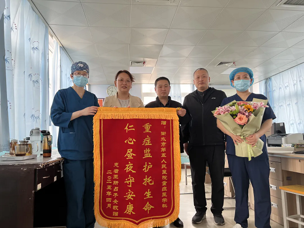 转身兄妹俩又匆匆赶到六楼重症医学科。见到重症科主任刘艳红和护士长任志新的瞬间,王女士快步上前,将写有“重症监护托生命,仁心昼夜守安康”的锦旗及鲜花送至刘艳红和任志新手中,并鞠躬致谢。